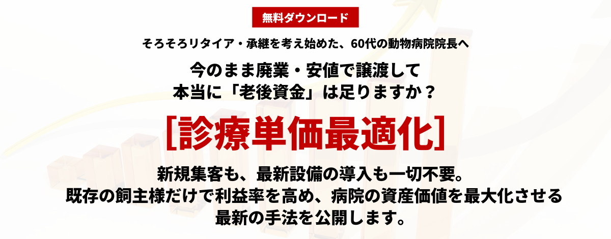 先生も薄々感じているはずです。ここ数年、飼主様の目は肥え、近隣には新しい動物病院ができ、材料費や光熱費は上がる一方…。