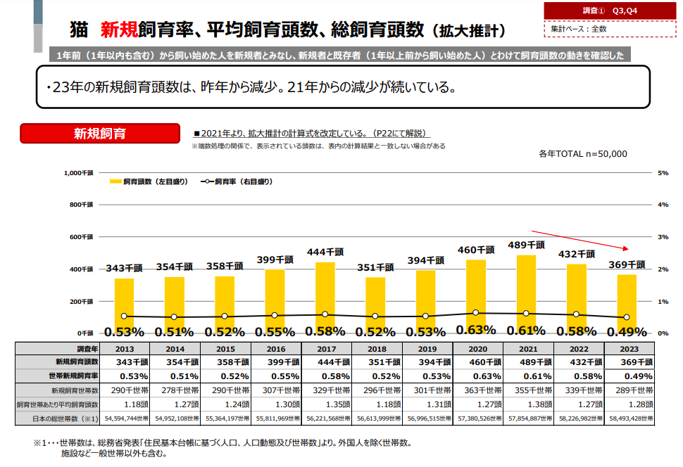 猫が2022年度432千頭→2023年度369千頭と、大きく減少しています。